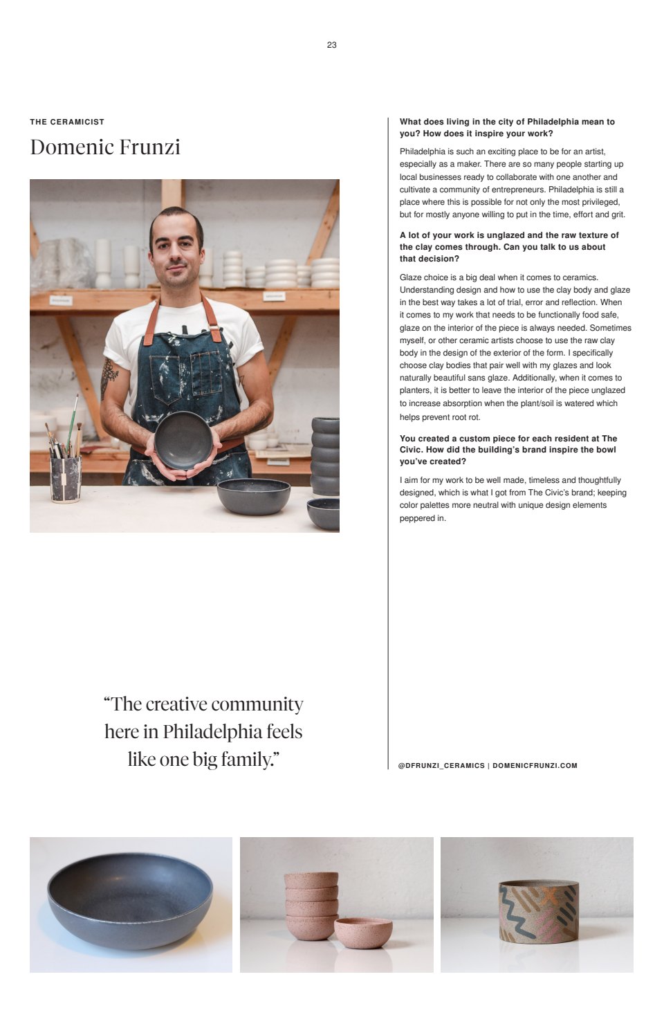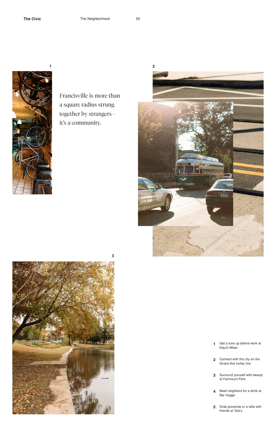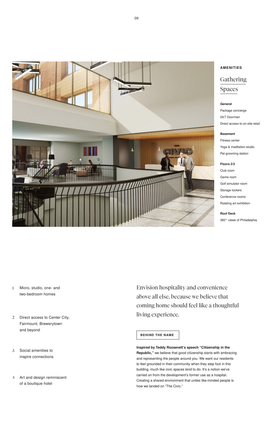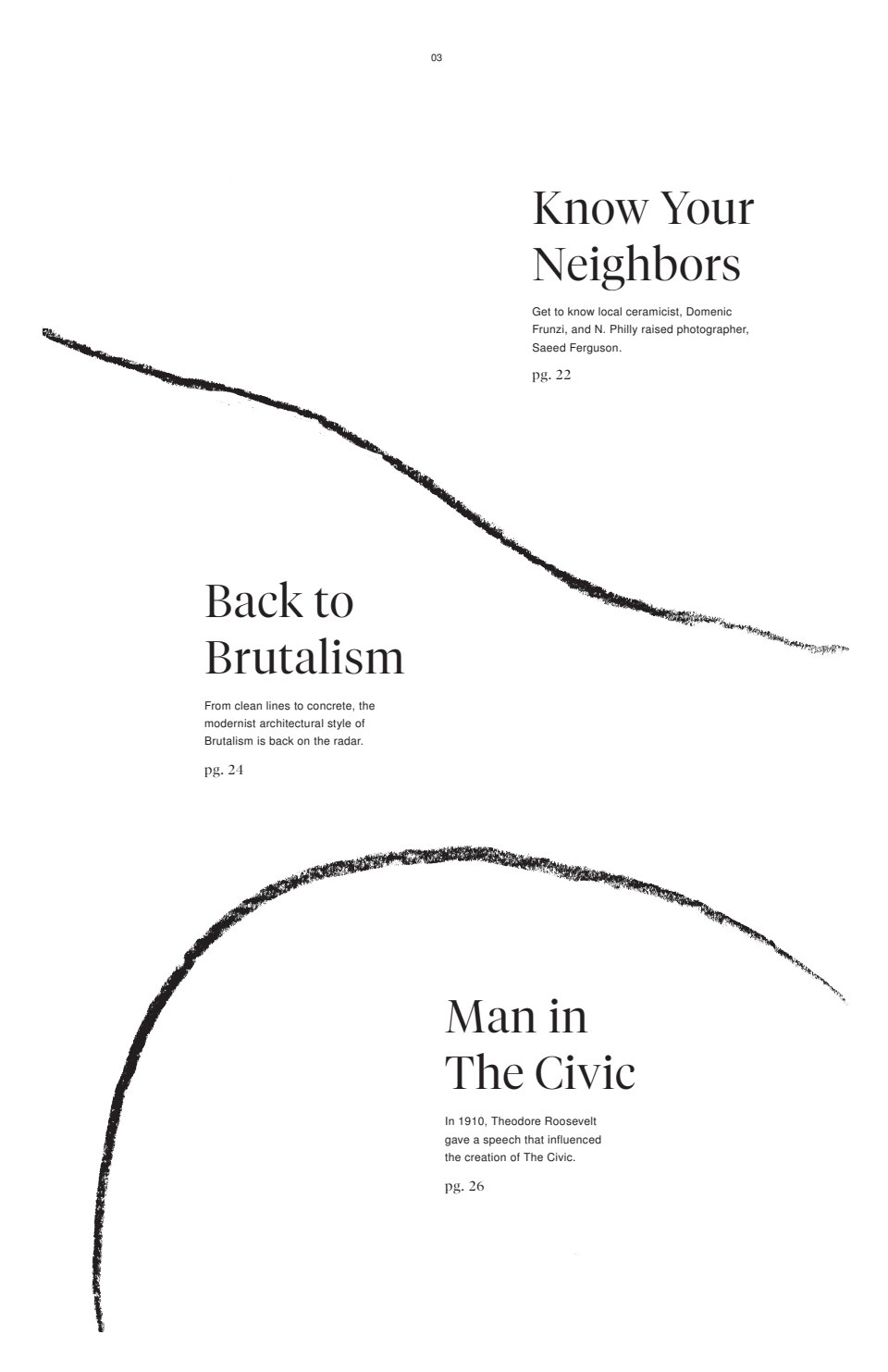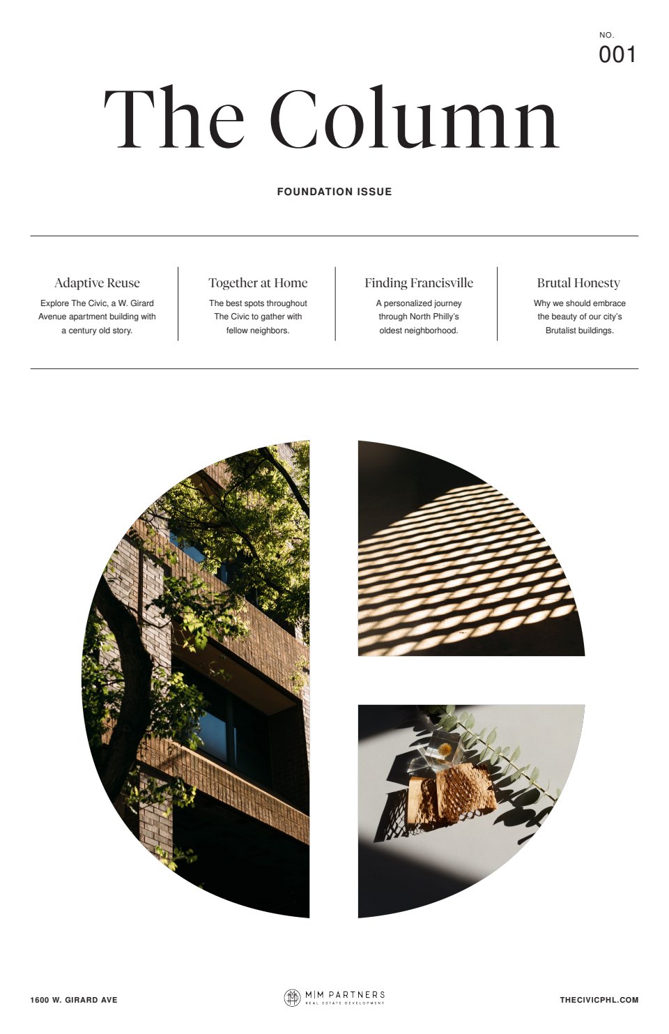 This newsprint publication embodies the essence of The Civic, showcasing elements inspired by its Brutalist architectural style. Inside, you’ll discover curated playlists that capture the creative spirit of North Philadelphia, interviews with local artists, custom material boards, and much more. This approach offers a refreshing perspective on traditional real estate development collateral, setting The Civic apart as a distinctive and culturally relevant project.