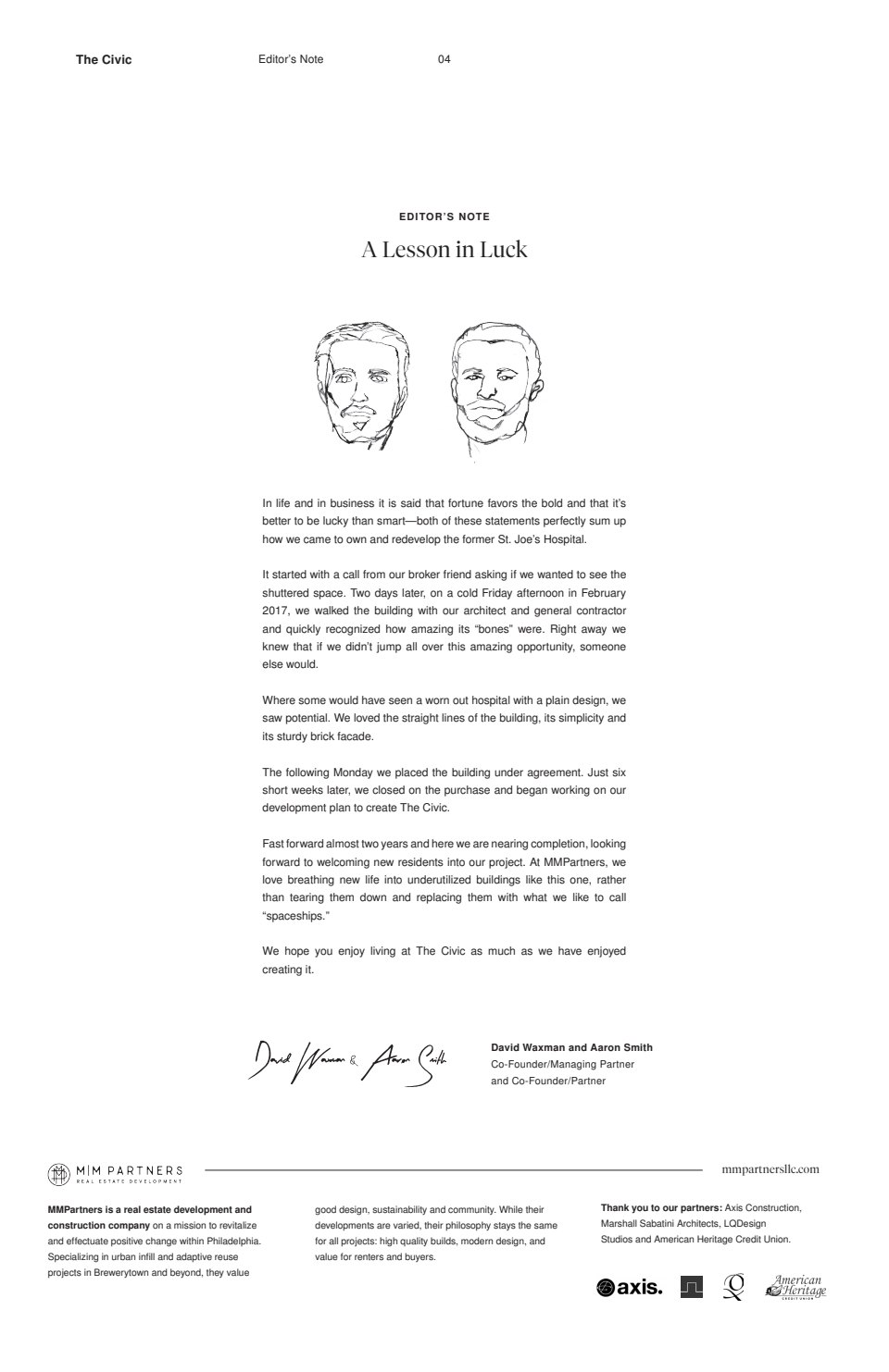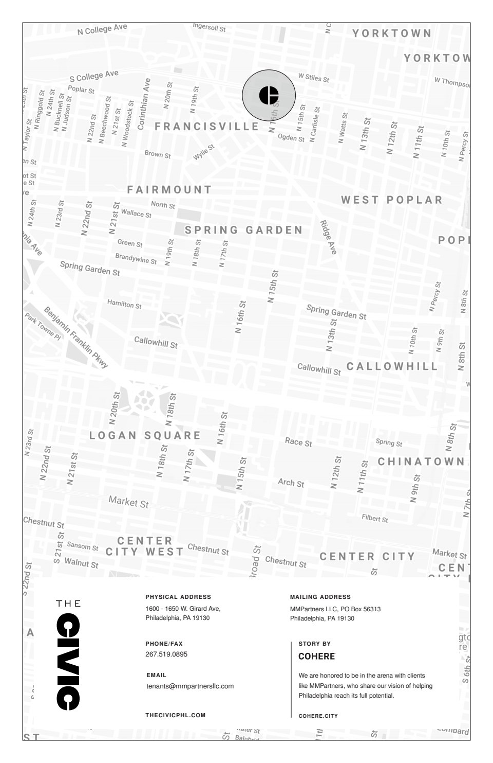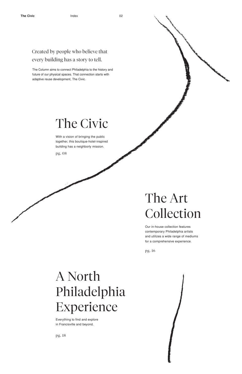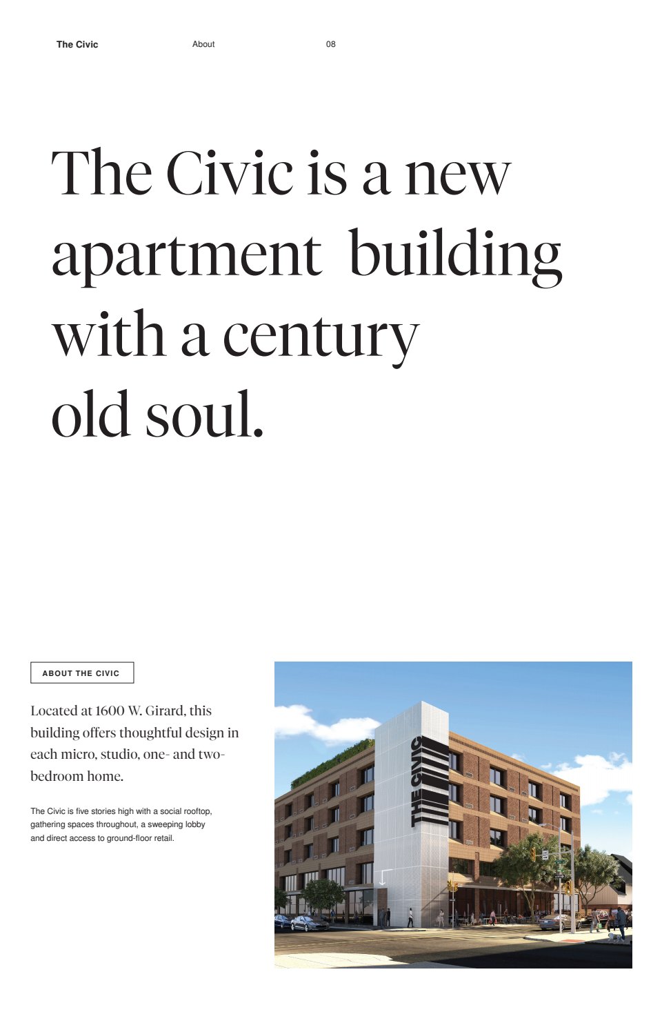 The Civic is an adaptive reuse development nestled within one of Philadelphia’s oldest medical facilities. In honor of the building’s rich history and its previous role as a civic space, we crafted a brand that is bold, minimalist, and reflective of the surrounding neighborhood.