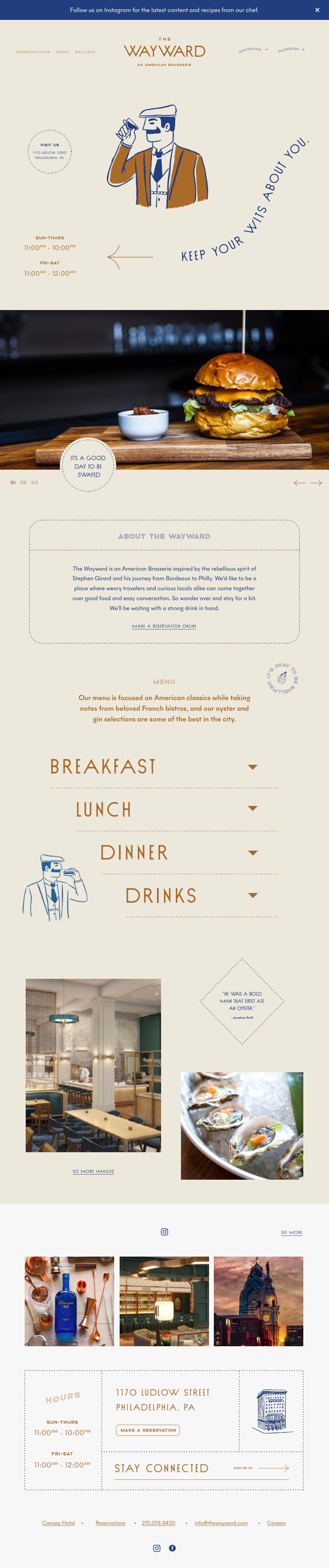 The final brand identity strikes a balance between playfulness and sophistication, positioning The Wayward as a vibrant addition to Philadelphia’s dining scene while honoring its historical roots.