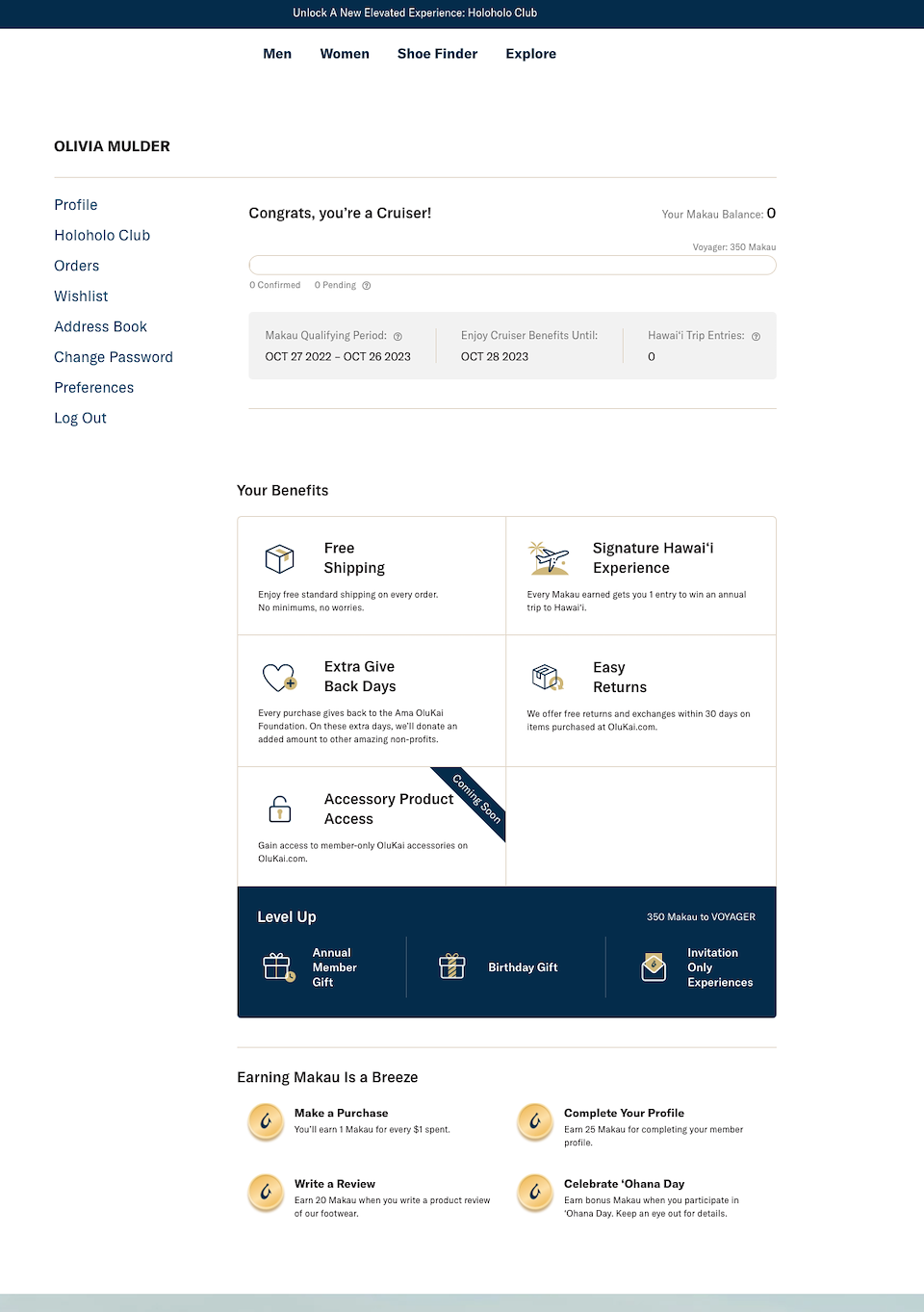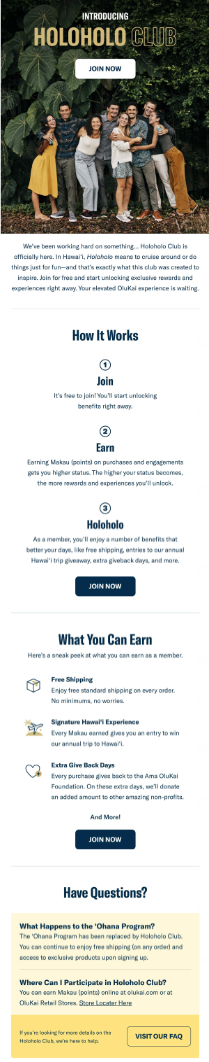 I developed naming and copywriting for OluKai’s loyalty program, designed to provide consumers with a rewarding shopping experience that offers unparalleled benefits, exclusive opportunities, and a deeper connection to Hawai‘i. The program rollout encompassed a landing page, conversion-focused email series, text messaging campaigns, homepage copy, and more.